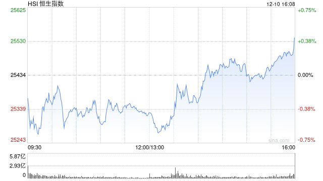 12月10日,港股三大指数集体上扬。截至收盘,恒生指数上涨0.42%,收于25540.78点;恒生科技指数涨幅为0.48%;国企指数则小幅收涨0.20%。盘面上,科网股普遍上涨,其中美团涨幅超过2%,百度、阿里巴巴、小米均录得超1%的涨幅;哔哩哔哩股价则小幅回调,下跌超1%。黄金股表现强势,灵宝黄金大涨逾9%;内房股走势强劲,万科企业涨超13%。此外,今日有两家新股挂牌上市,图达通大涨33%,宝济药业更是飙升138%。