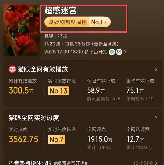 但《超感迷宫》完全不同。开播仅三天,总播放量已突破两亿次,豆瓣评分一经开放即达8.2分,超过今年95%同类型作品。