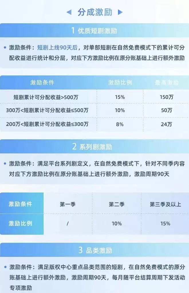 与此呼应,在11月27日大会收官当天,抖音短剧版权中心正式启动春节短剧专项激励计划,不仅给出80万到200万的项目评级保底激励金,50万至150万的宣发级剧目单剧宣发预算,还设置了多元的额外分成系数激励机制。