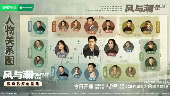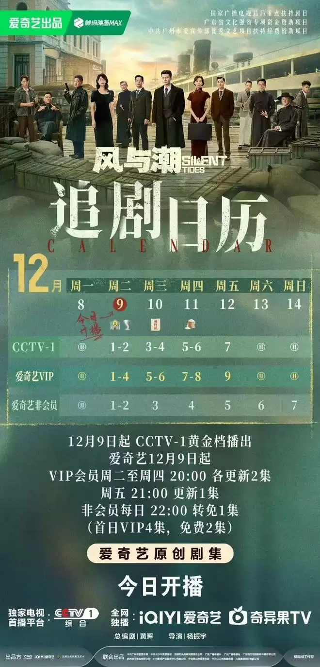 《风与潮》从12月9日起,CCTV1每天20:00播出,爱奇艺全网同步播出,会员首更4集。