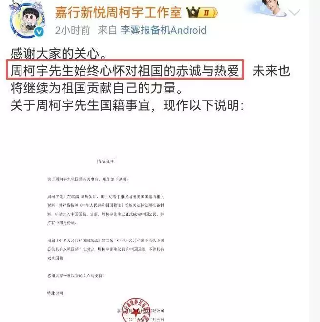 工作室随即发布声明:“柯宇年满十八岁后主动申请退出美国籍,现已正式成为中国公民。”