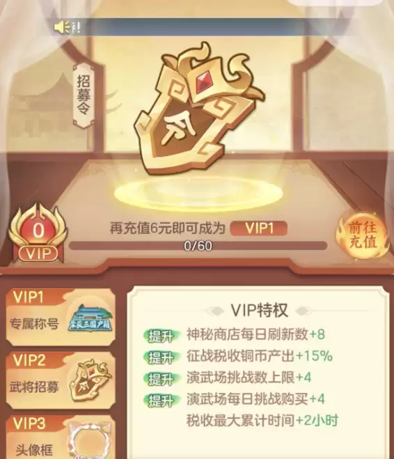 为了让玩家有更多选择,游戏中还设有新手成长活动。只要是新手玩家就能参与全新的登陆礼包,在这个福利满满的礼包中,能获得许多初期发展资源。另外还会有招募令充值玩法,玩家可以通过充值6元来提升自己的VIP等级。等级升高之后,除了能获得专属称号,还有机会招募到更多强力的名将。同时,自己每天的经验产出以及各种铜币产出也都能得到提升。