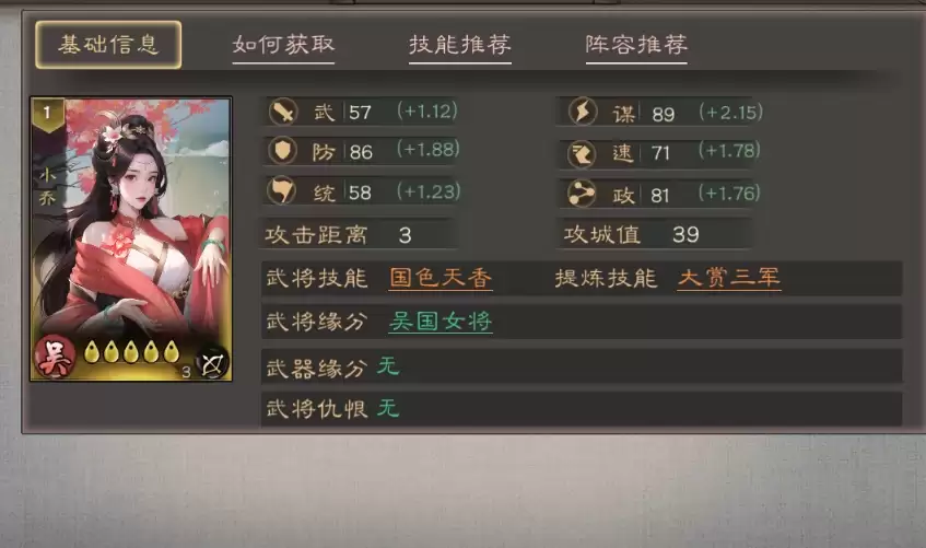 在《三国乱世霸王》中,小乔这位武将究竟实力如何?她自带的“国色天香”技能能为全军提供稳定的持续续航,当搭配输出核心时,更能大幅提升队伍的持续作战能力,同时她也完美适配“吴国女将”的缘分体系。