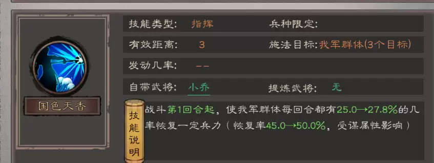 效果:每回合使我军3个目标有25.0%→27.8%概率恢复兵力(实际恢复率45.0%→50.0%,受谋略属性影响)