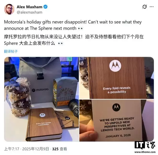随着1月国际消费电子展(CES)临近,各大科技巨头纷纷开始预热。摩托罗拉及其母公司联想为2026年1月6日举办的“联想科技世界”活动,近期向媒体寄送了节日礼包。
