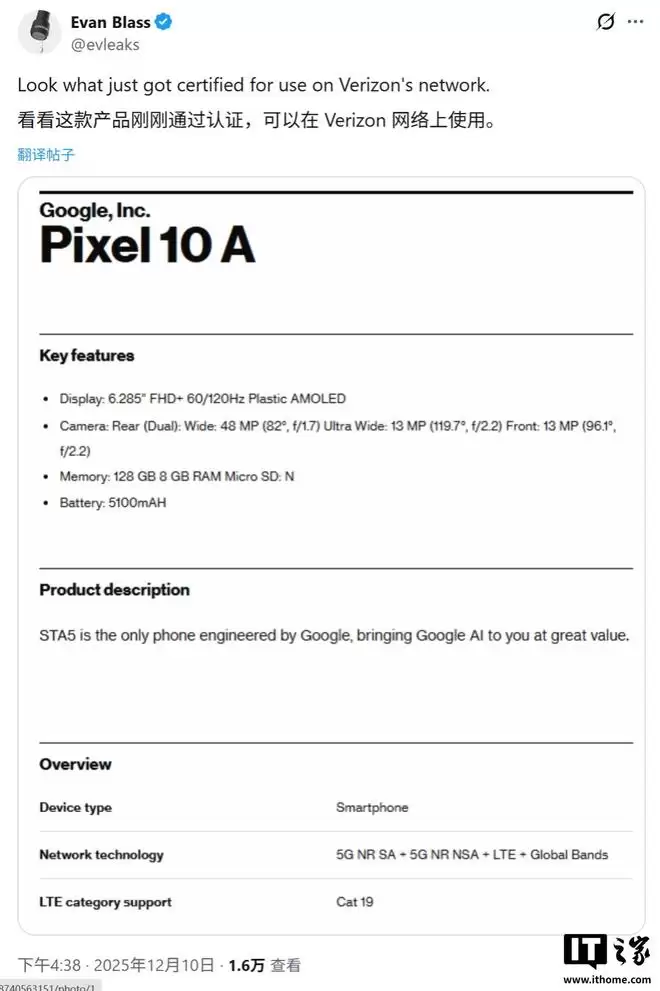 12月11日,IT之家报道称,知名爆料人Evan Blass昨日(12月10日)在X平台分享了一份来自美国运营商Verizon的认证文件,首次披露了谷歌Pixel 10a手机的部分核心规格。