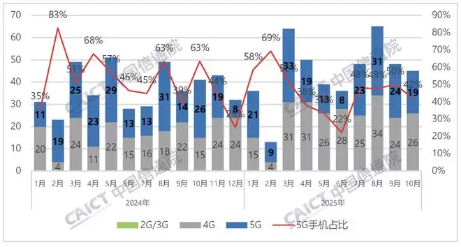 在产品更新方面,2025年10月,国内市场新上市的手机机型共计45款,同比增长9.8%。然而,其中5G手机的新机型为19款,同比下降26.9%,占同期新机总量的42.2%。