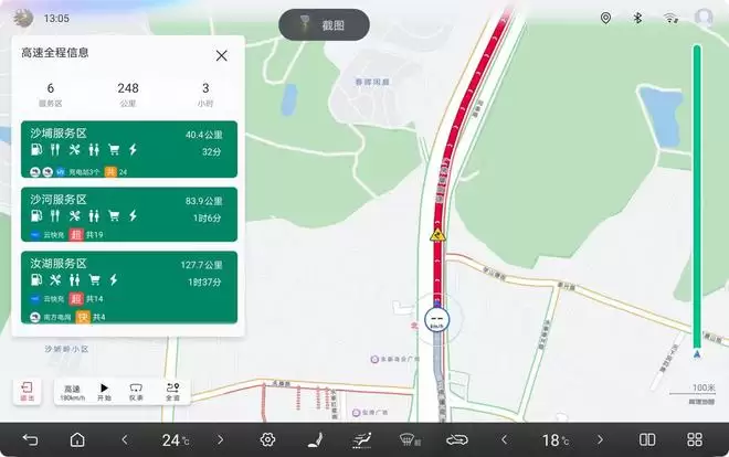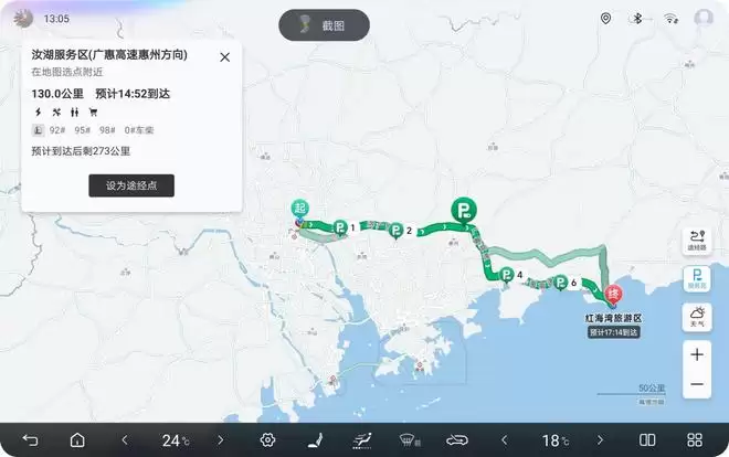 考虑到用户长途出行中需要进行休息与补给的需求,本次OTA还新增了将高速看板服务区添加为途经点的功能。用户可以快捷地将高速服务区添加为途经点,或是从路线中将其删除,从而灵活安排途中休息与补给的计划。
