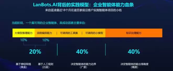 欲破局,先入局。基于过去18个月逾百个AI项目的实践,蓝凌发现,一个真正能在企业内运行出好效果的智能体,其主要依赖三类能力,包括:20%为智能体自身运转能力(含大模型推理与流程编排),40%为可调用工具集与小模型(决定智能体能力边界),40%为企业知识治理能力(决定智能体输出准确度)。蓝凌软件副总裁刘向华表示:“因为对这个能力血条模型的判断,最近两年我们将智能体产品的主要资源投入到工具集优化与数据质量提升上,并取得了突破。蓝凌觉得,应该努力把苦活累活留给自己,把简单留给客户。”