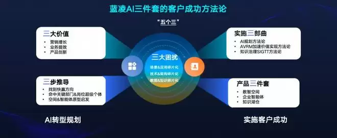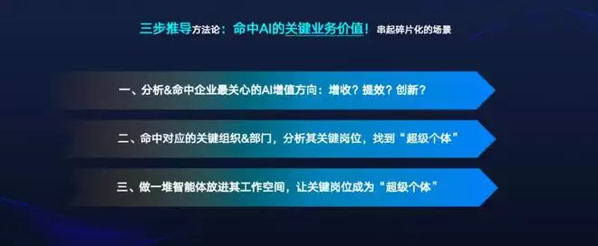 蓝凌AI三件套有配置的客户成功方法论,其中三步推导方法论,旨在命中AI的关键业务价值,串起碎片化的场景。首先,要分析&命中企业最关心的AI增值方向:增收?提效?创新?其次,涉及关键目标的关键组织&部门是什么,并分析其关键岗位;然后通过构建大量智能体,帮助该关键岗位成为“超级个体”,进而由众多“超级个体”助力组织一起成长。
