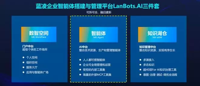 全新推出的蓝凌LanBots.AI三件套产品,覆盖智能体从建设、管理到应用全生命周期,形成“建管用”一体化的完整价值闭环,而这在企业级AI智能体领域颇为独特。