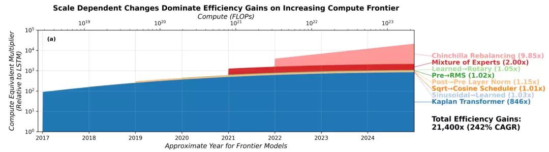 2. 本文发现有两项强烈依赖规模(scale-dependent)的算法创新:从LSTM到Transformer架构的转变,以及从Kaplan到Chinchilla的最优缩放定律。当将其外推至2025年的计算前沿时,这两项创新合计占据了全部效率提升的91%。这意味着:对于小规模模型而言,算法进步的幅度比此前认为的要小几个数量级。
