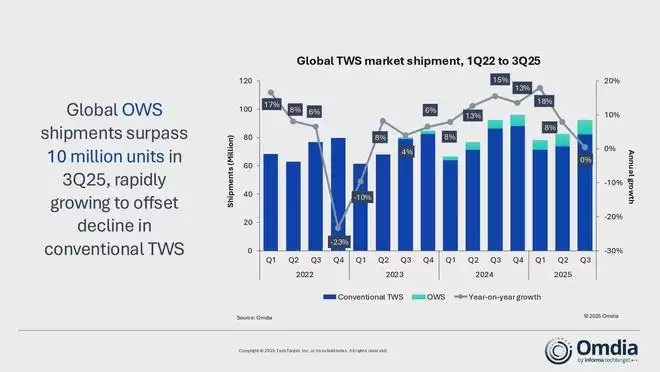 12月10日,国际市场调研机构Omdia发布了2025年第三季度全球真无线蓝牙耳机市场报告。数据显示,过去一个季度全球TWS耳机总出货量达到9260万台,但同比增幅仅为0.33%,增长近乎停滞。与此同时,非入耳式TWS设备(即OWS)的表现却颇为亮眼,整体出货量突破1000万台,实现了69%的同比强劲增长。正是OWS市场的增长,有效对冲了传统入耳式TWS出货量的下滑趋势。