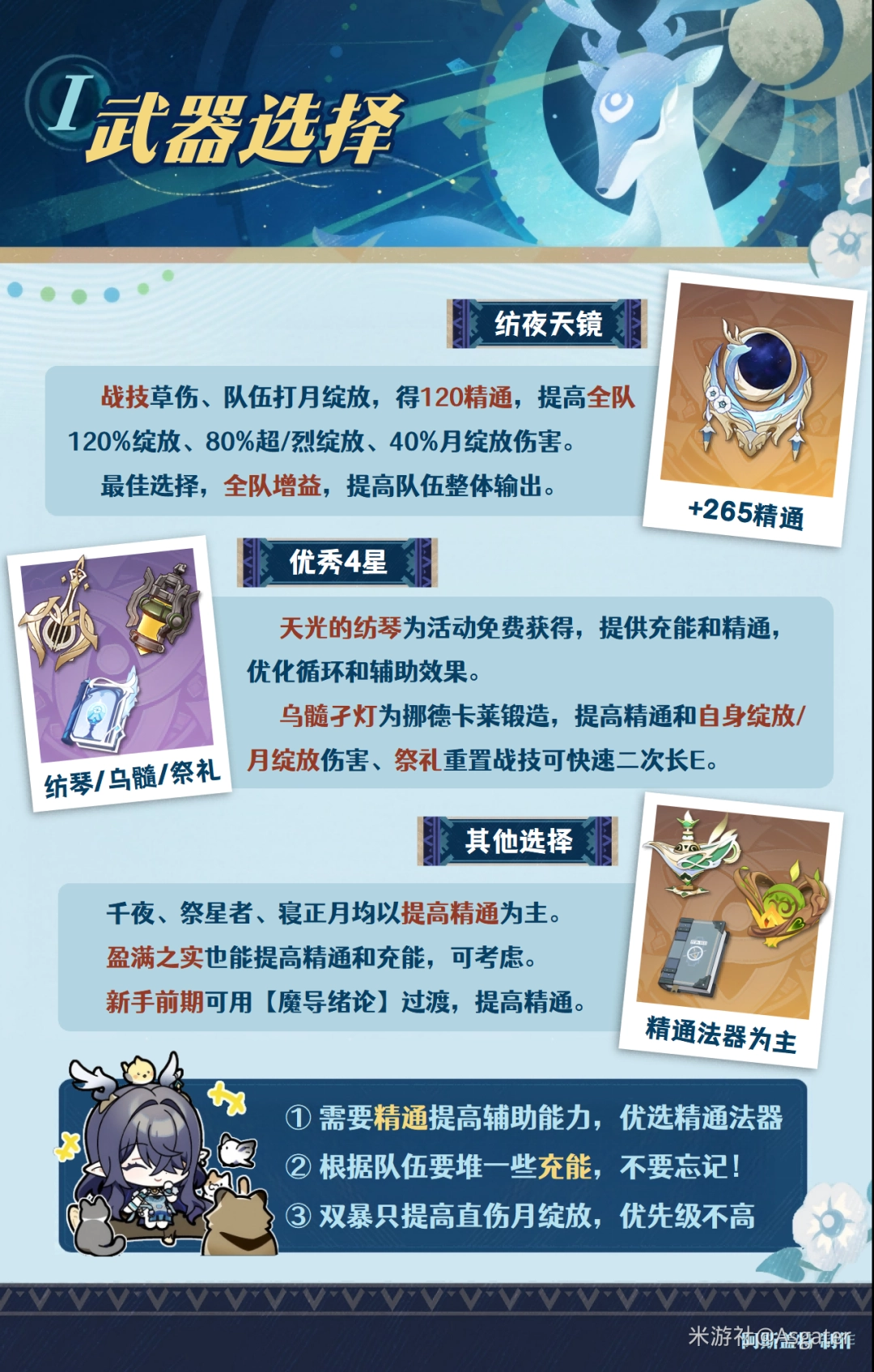①【天光的纮琴】是“月之一”版本活动中免费获取的限定武器,兼具精通和充能提升,完美契合莱欧玛所需的核心属性。