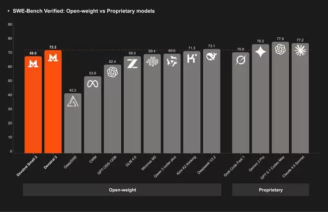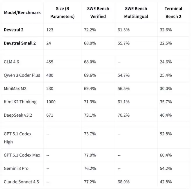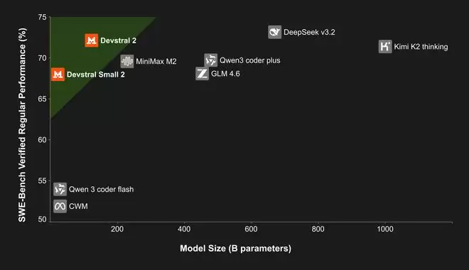 Devstral 2系列模型的亮点在于小参数设计,其模型在关键基准测试中展现出和顶尖开源模型齐平的性能,却仅需后者几分之一的参数量。