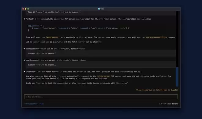 Mistral Vibe提供了一个交互式对话界面,集成了文件操作、代码搜索、版本控制及命令执行等工具。