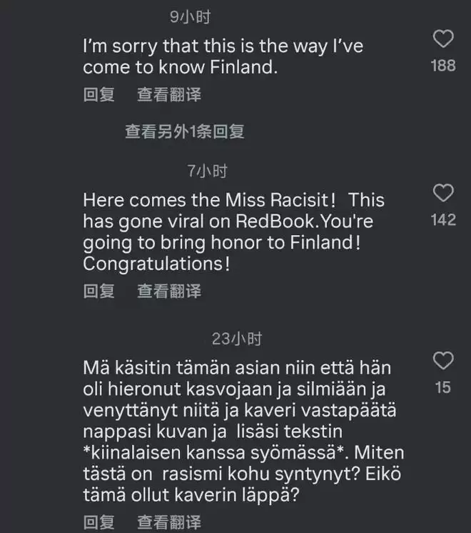 结果一转头,芬兰小姐一边拉着眼角搞歧视,一边为照片配文“和中国人吃饭”,这难道不是辱(ru)华(hua)吗?