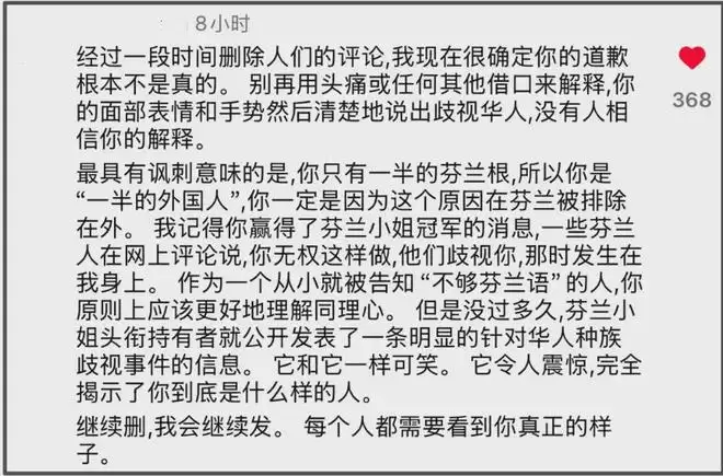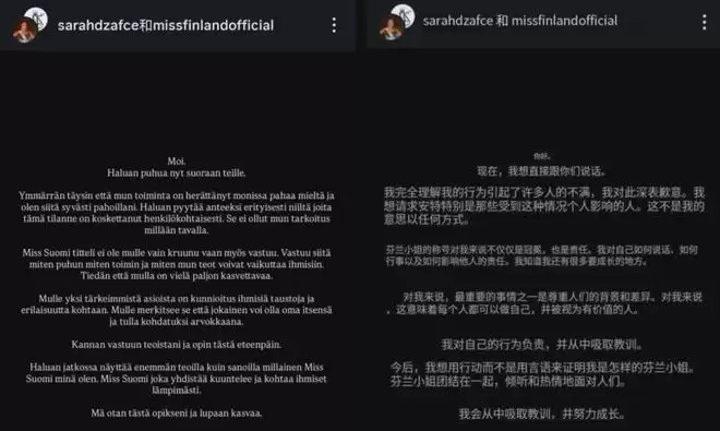 就看Sarah和芬兰小姐主办方账号联合发布了道歉,数次强调自己配得上芬兰小姐的称号,就知道网友抵制方向没有错——还是得抵制到取消她的头衔才行!