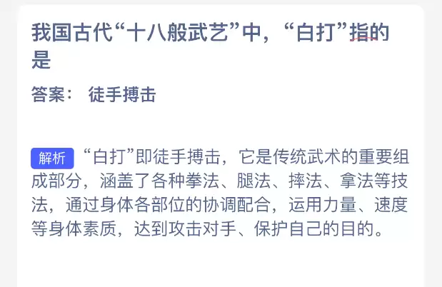 1、题目:我国古代“十八般武艺”中,“白打”指的是?
