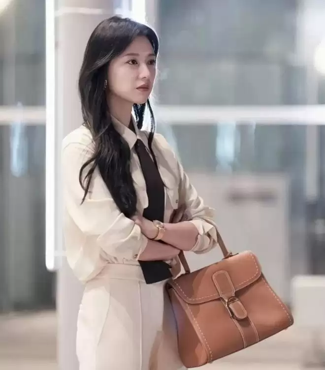 这只手提包则来自Delvaux,算是通勤剧“钉子户”了。他们家基本没有大力商业营销,设计也没有赶时髦,包袋上新速度常常被调侃和周董出新专辑有的一比。韩剧女主都很爱背。