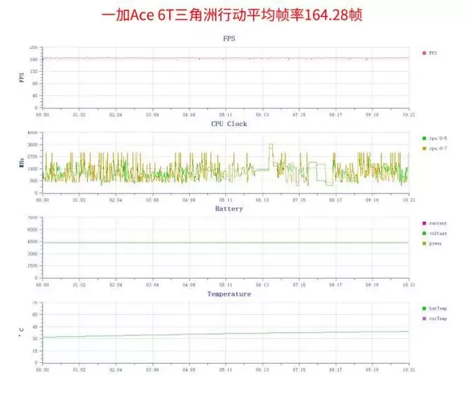 接下来看看游戏实战,三角洲行动全面战场攻防模式中,一局游戏平均帧率达164.28帧,1% LOW也高达159.96帧,运行十分稳定。需要说明的是,一加Ace 6T在开启165帧模式后,画质会限制为“流畅”,而一加15可以开到“精致”画质,因此一加Ace 6T与旗舰之间还是存在一些性能差距。不过对玩家而言,有没有165帧模式更重要,毕竟流畅性是能决定胜负的。