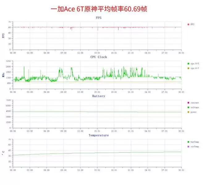 《原神》40分钟跑图打怪测试中,一加Ace 6T平均帧率60.69帧,1% LOW帧56.4帧。正面温度40.5℃,背面40.8℃,手感仅温热。