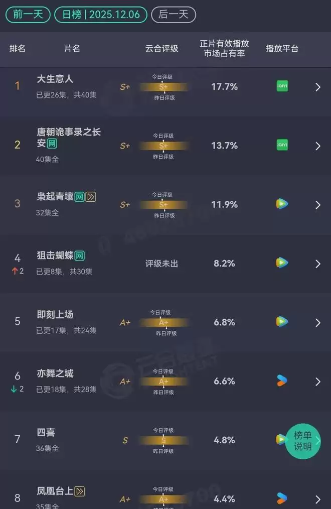 《亦舞之城》凭借钟汉良、秦岚的国民度开播即稳占优酷剧集榜首,但后续因剧情节奏拖沓,“认子”“复合”桥段冗长高开低走,后期乏力。