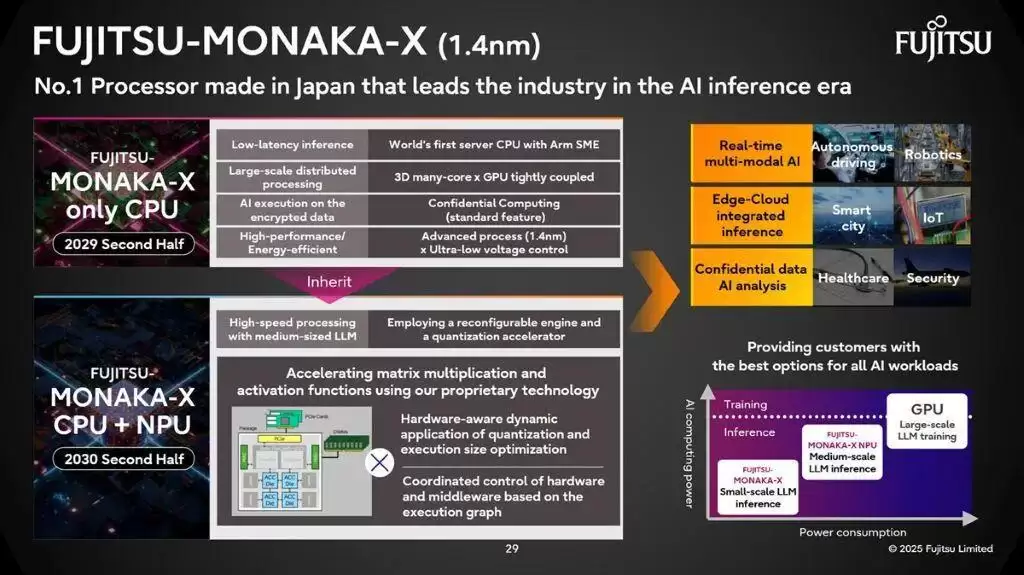 根据富士通公布的未来规划,后续还将推出Monaka-X处理器产品线,分为纯CPU版本以及CPU+NPU版本。其中纯CPU版本目标在2029年末推出,采用3D多芯片模块布局及更先进的1.4纳米制程技术,硬件安全计算功能将成为其标准配置,它也将是首款支持Arm SME扩展的服务器处理器。至于CPU+NPU版本,则计划在2030年下半年推出,额外增加了一个面向中型大语言模型(LLM)的专用NPU模块。最后,富士通还透露,到2031年还将有基于1.4纳米制程的Monaka-XX处理器问世。