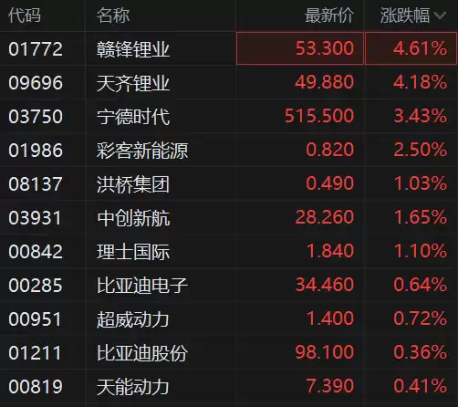港股锂电池板块普涨:赣锋锂业、天齐锂业涨超4%