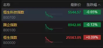 12月11日,港股市场三大指数表现分化。截至午盘收盘,恒生指数小幅上涨0.09%,报收于25563.05点;恒生科技指数则下跌0.65%,而国企指数微跌0.13%。板块方面,科网股普遍承压,多数下跌,其中哔哩哔哩逆势上涨近1%,联想集团跌幅超过1%。锂电池板块涨幅领先,宁德时代上涨超过2%;芯片股走势疲软,中兴通讯重挫逾9%;京东工业今日挂牌上市,股价小幅下跌0.07%。