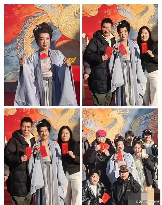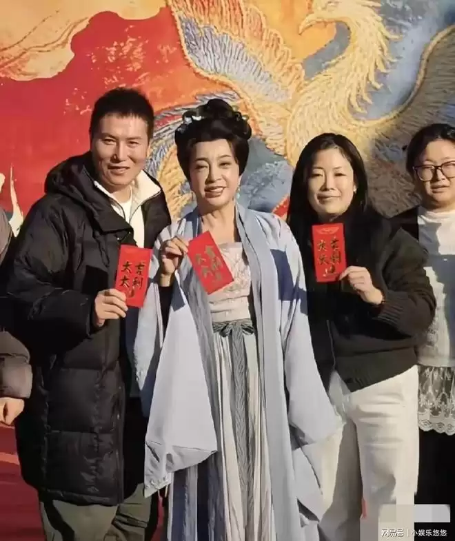 她的脸部有点浮肿,眼袋好重了,尤其和旁边的年轻演员合影,更能显出她的老。