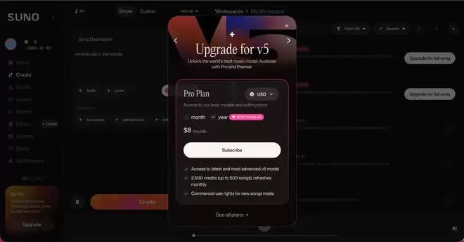 例如在QQ音乐、酷狗音乐,用户最低支付10元可获得2首AI歌曲,相当于每首歌的制作成本为5元。而在Suno平台,除了免费使用的模型外,专业版包年会员的单月价格为每月8美元,至多可以生成500首歌曲,相当于每生成一首歌只需要支付0.016美元(0.11元人民币)。