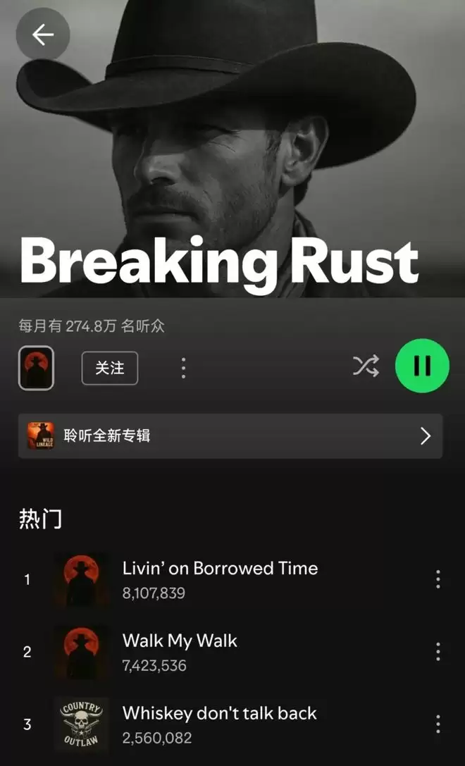 惊蛰研究所还注意到,《Walk My Walk》的署名艺人Breaking Rust在Spotify上已发布超过10首歌曲,其中热度最高的3首歌曲总播放量已经超过1800万次。这意味着,Breaking Rust这个署名背后的创作者可能仅凭3首AI歌曲,就在单一平台获得了超过7.2万美元(约51万人民币)的收入。