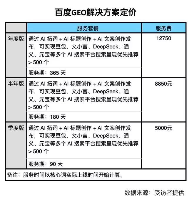 目前,百度GEO服务提供季度版、半年版、年度版的三个付费套餐,服务费分别为5000元、8850元、12750元。