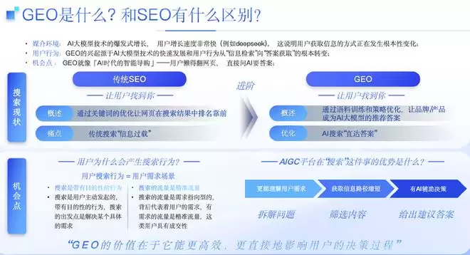 GEO(Generative Engine Optimization),即生成引擎优化,指让广告主在AI搜索结果中获得更高曝光率和排名的一种服务。与之对应的概念是SEO(Search Engine Optimization),搜索引擎优化。前者强调自然展现、提供类似智能导购的无感营销体验;后者则有赖于用户手动搜索,因此需要广告主通过提升网页排名来增加点击、转化率。