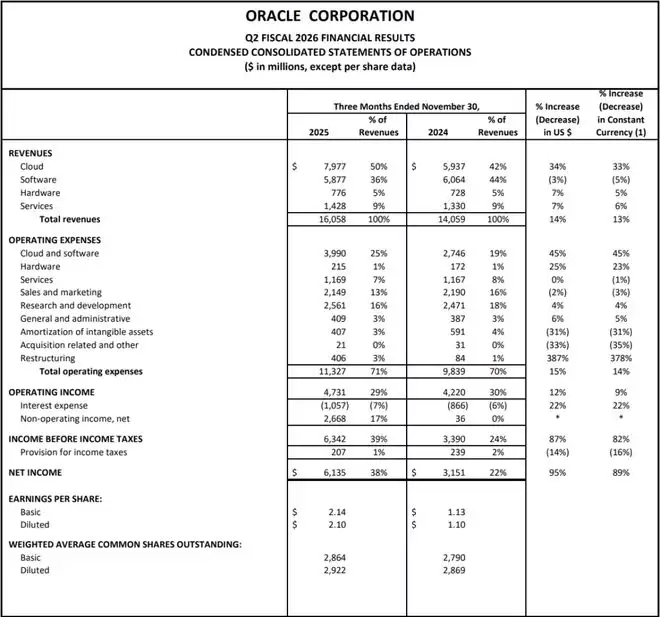 当地时间12月10日美股盘后,甲骨文公布了截至11月30日的2026财年第二季度业绩。财报显示,该公司当季实现营收160.6亿美元,同比增长14%,略低于市场预期的162.1亿美元;净利润为61.4亿美元,同比大幅增长了95%;非GAAP下调整后每股收益(EPS)为2.26美元,高于市场预期的1.64美元;同时,其运营利润率达到42%。