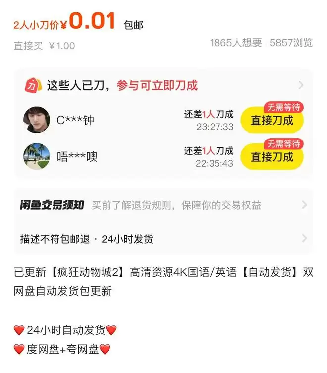记者调查发现,在某些二手商品交易平台上,不少商家正在以低至0.01元的价格售卖《疯狂动物城2》的盗版资源。这些资源通常通过网盘链接传播,各种语言的4K版本都能轻易获取,还支持下载和投屏观看。商家将价格设置在0.01元到3元之间,许多商品的销量显示已超过1000份。