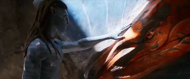 接下来便是所有人都关注的视听和动作了,这也是《阿凡达》系列的立足之本。果然正如媒体所说,《阿凡达3》拥有着系列最大的场面,这会让《阿凡达2》看起来有些格局不够。开场的动作戏就令人血脉喷张起来,同时进一步呈现了潘多拉的唯美以及生物的多样性。