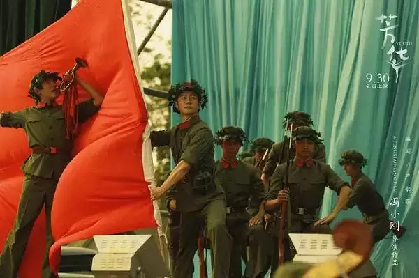 开寅《芳华》给我印象最深的,是那些写在文工团大门和影壁上的硕大、粗旷而有力的宋体字标语口号,以及无处不在的领袖像、党徽、军徽、颜色明亮鲜艳的旗帜、横幅和墙画。它们像凝固在时间隧道中的里程碑,回溯的是