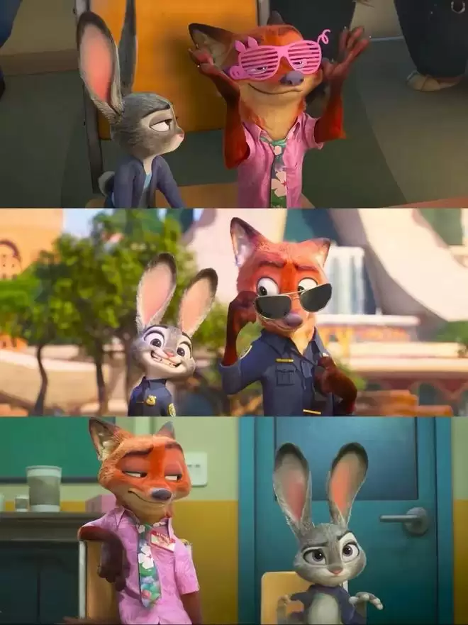 最具创意的则是朱迪与尼克为了人物而“伪装”的格式各样的“变装”,都展现出了与平时“警官”装扮完全不用的造型,叛逆且充满个性,完美呈现了他们的“街头文化”氛围。