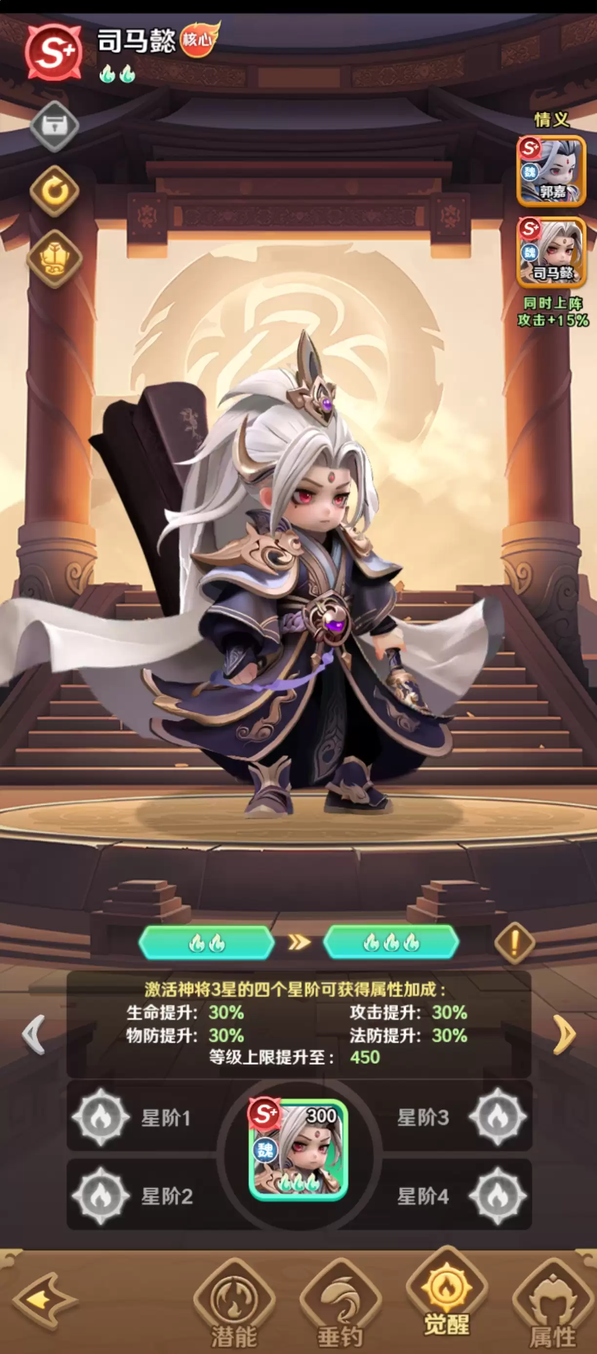 既然司马懿如此强悍,他的星级与技能等级成长更能让他的伤害持续提升。一旦升至高级星阶,所带来的质变效果会尤其明显。玩家在合理运用司马懿时,武器方面应优先选择提升攻击力和怒气值的装备;防具方面则侧重生命值与法术防御。