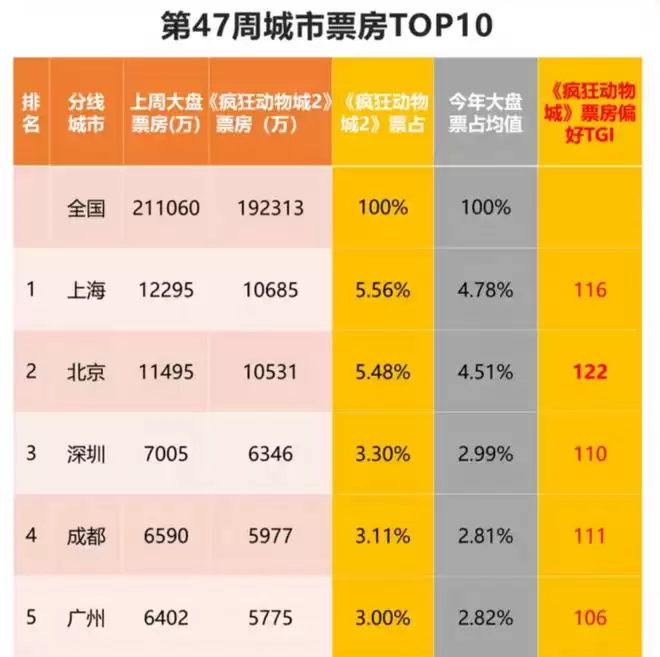 △ 上海、北京、深圳占据了《疯狂动物城2》票仓城市前三名