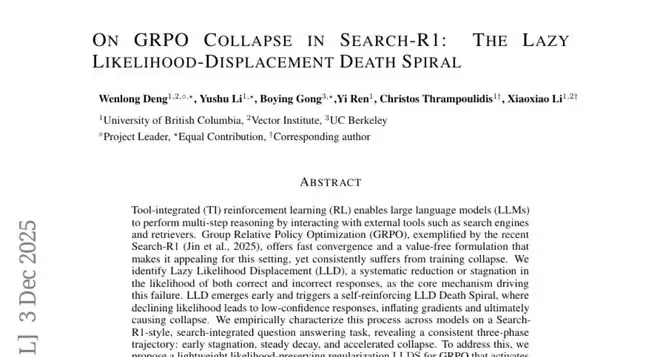 这项由英属哥伦比亚大学的邓文龙、李玉舒等研究团队以及加州大学伯克利分校的龚博英合作完成的研究,发表于2025年12月3日的arXiv预印本平台(论文编号:arXiv:2512.04220v1)。研究团队深入分析了当前最先进的AI搜索助手在学习过程中遇到的一个严重问题,这个问题被他们称为"懒惰似然位移死亡螺旋",并提出了一个简单而有效的解决方案。