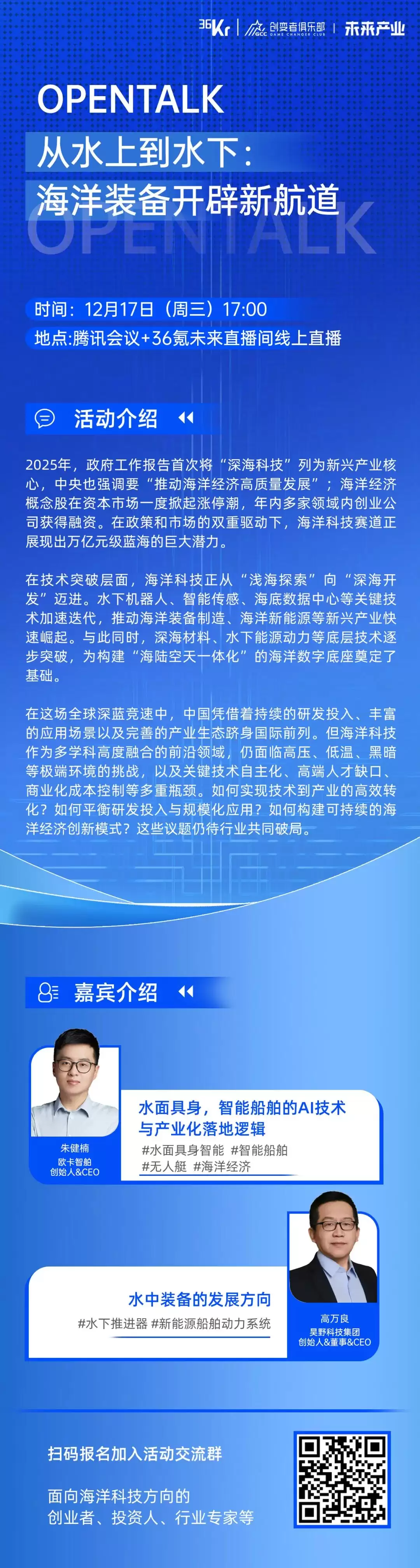 2025年12月17日(周三)17:00,OpenTalk将特别举办「从水上到水下:海洋装备开辟新航道」直播活动。我们特邀欧卡智舶创始人兼CEO朱健楠、昊野科技集团创始人兼董事长兼CEO高万良两位嘉宾,他们将分别围绕“水面具身,智能船舶的AI技术与产业化落地逻辑”与“水中装备的未来发展方向”两大主题展开深度分享。活动将聚焦智能船舶、水面无人驾驶系统、水下推进器、新能源船舶动力系统等前沿热点,共同探讨海洋科技领域的“破局点”与“未来式”。