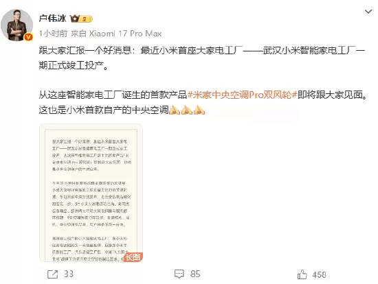 卢伟冰披露小米首座大型家电工厂投产,自研中央空调即将面世