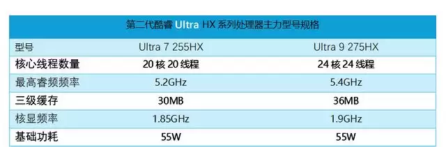 2025年,英特尔带来了全新的第二代酷睿Ultra HX系列移动平台处理器,并成为2025年最受用户关注的笔记本新硬件之一。第二代酷睿Ultra HX处理器带来了多项创新,主要特点有:采用全新架构、3nm工艺打造;去掉了超线程,最高规格为24核24线程(8P+16E);基础功耗为55W,最大睿频功耗160W;支持256GB DDR5内存等。第二代酷睿Ultra HX处理器不仅在性能上大幅度超越了前代处理器,更在断电时的功耗控制有着颠覆性的表现。该系列处理器主要有6款型号,不过由于第14代酷睿HX处理器依然在游戏本上大量装载,所以大家常见的是两款主力CPU,即20核20线程的Ultra 7 255HX、24核24线程的Ultra 9 275HX。