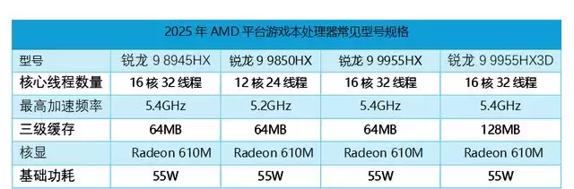 2025年,AMD在游戏本CPU上主力产品主要为两个系列HX处理器,即全新推出的采用Zen 5架构、4nm制程打造的锐龙9000HX系列处理器与采用经典Zen 4架构、5nm制程打造的锐龙8000HX处理器,最高规格均为16核32线程。其中,锐龙9000HX系列处理器有3个型号,即16核32线程的锐龙9 9955HX/锐龙9 9955HX3D、12核24线程的锐龙9 9850HX,主要搭载于AMD平台中更为高端的游戏本上。锐龙8000HX处理器的主力CPU则主要是16核32线程的锐龙9 8945HX/锐龙9 8940HX,主要用于相对入门的游戏本上,在有国补优惠的时候,6000元以内既能买到锐龙9 8945HX+RTX 5060的游戏本,性能与性价比都相当突出。