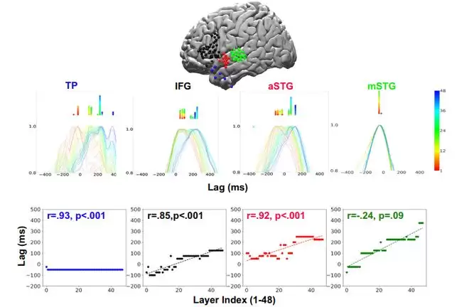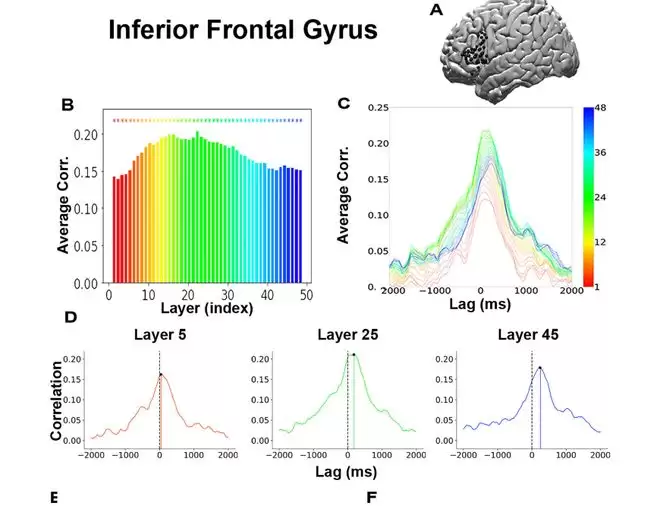 在关键语言区IFG内部,GPT的层级结构同样呈现强烈的时间对应关系。左:浅层至深层的相关度分布(暖色→冷色)。右:浅层峰值更早、深层更晚,形成规律性的时间推移。IFG 的整体拟合度达到r=.85(p < .001)。