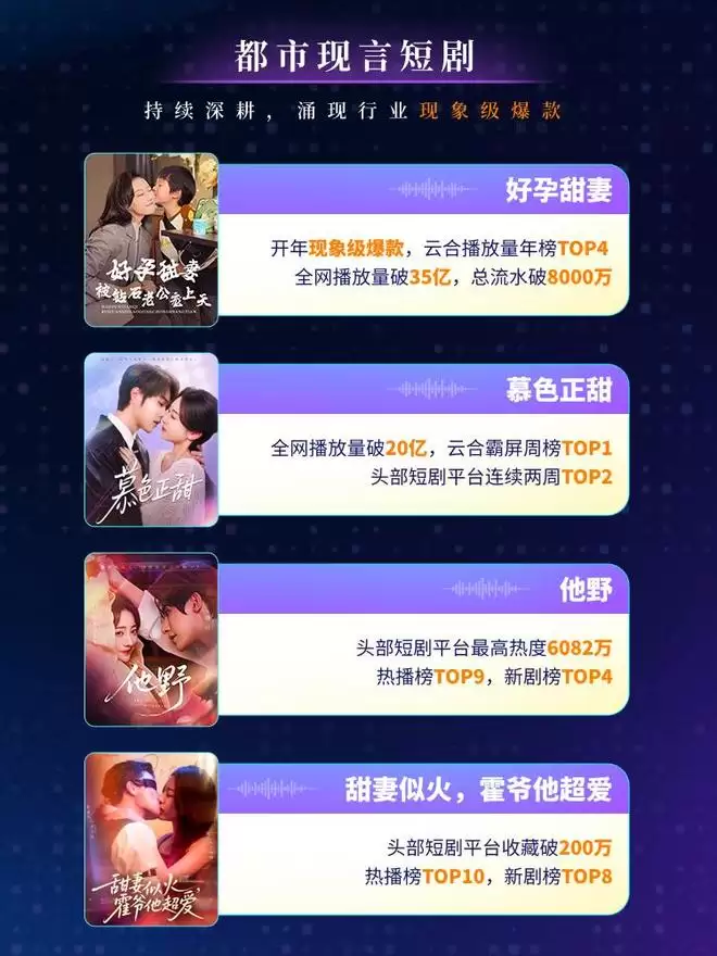 作为开年重磅力作,由阅文短剧出品、白金作家公子衍操刀的原创都市轻喜短剧《好孕甜妻》一举打响开门红,成为年度现象级爆款。目前,该剧全网播放量已超过35亿,总流水突破8000万,位居付费月榜TOP1。随后,同样由公子衍担任编剧的《慕色正甜》延续轻松搞笑的都市言情风格,斩获云合数据微剧有效播放霸屏榜周榜TOP1,在头部短剧平台周榜连续两周位居TOP2,热度突破7600万,全网播放量突破20亿。