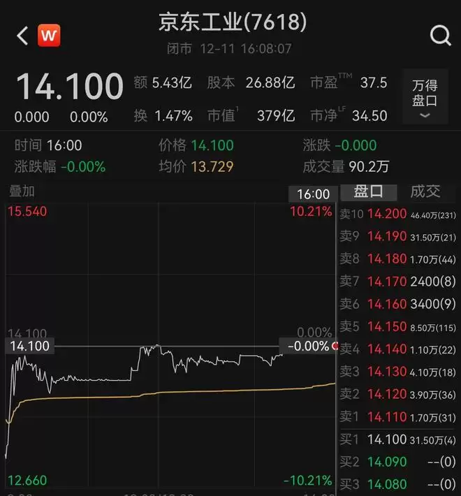 截至收盘,京东工业报收14.1港元/股,与发行价持平,总市值达379亿港元。